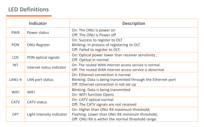- PWR/PON/LOS/INT/LAN1-4/CATV/WIFI/OPT